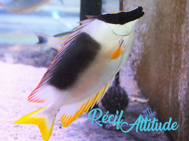 Poisson-lapin de la famille des Siganidae, reconnaissable à son corps blanc éclatant, ses nageoires et sa tête noires contrastées, ainsi qu’une tache jaune vif sur la queue. Élégant et actif, il apporte une touche unique aux aquariums récifaux tout en participant naturellement au contrôle des algues.