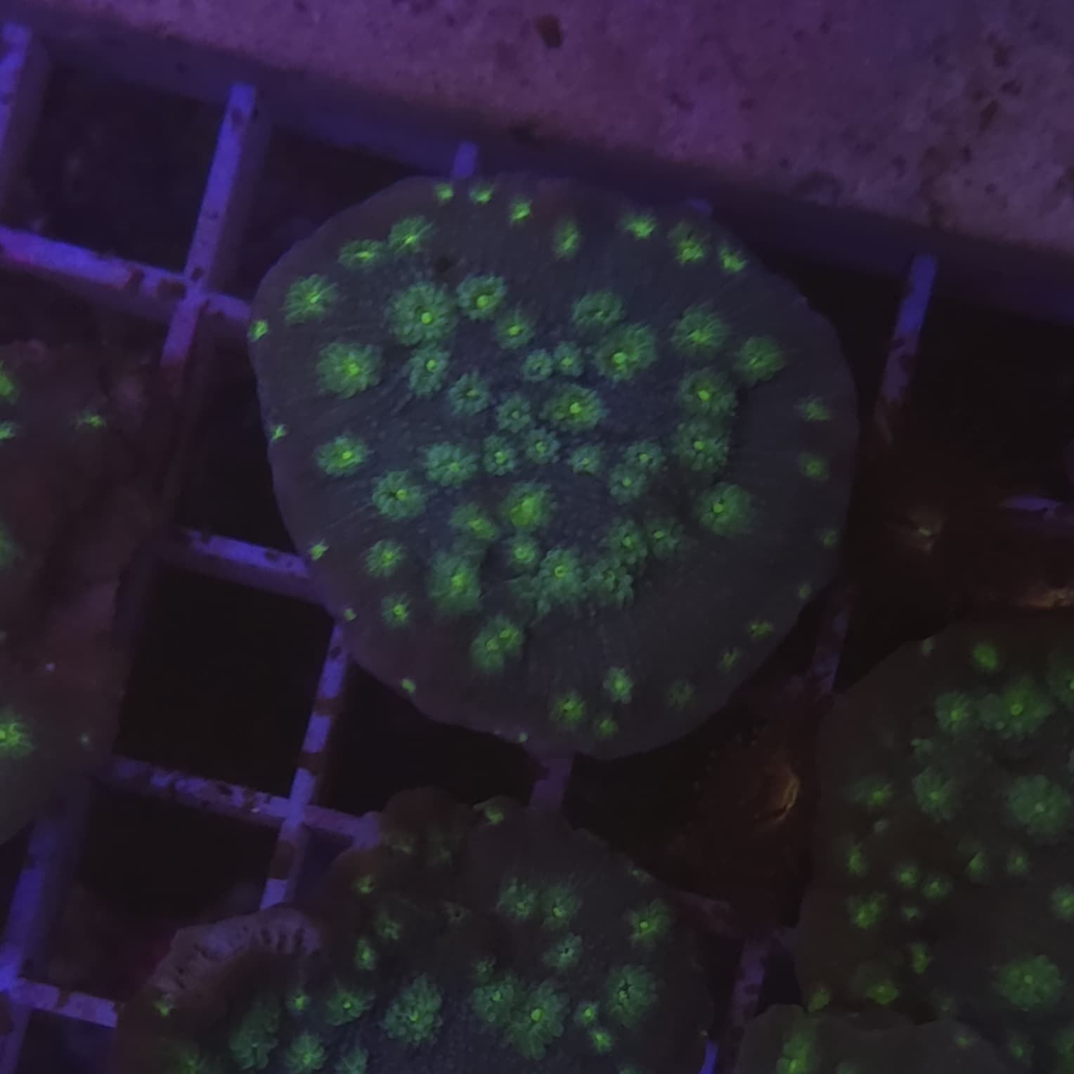 Taille : polypes de 3 à 10 cm, disposés sur un squelette corallien plat ou légèrement ramifié, formant parfois de larges colonies.