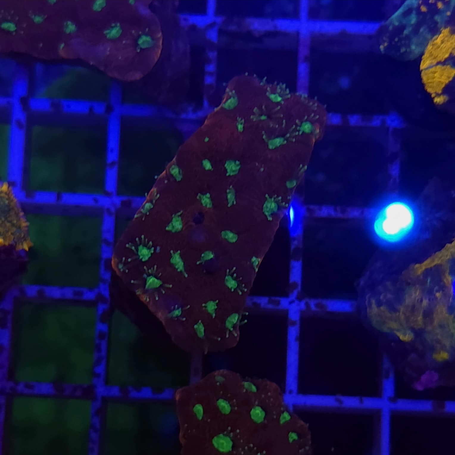Taille : polypes de 1 à 3 cm formant des colonies denses en plaques ou en dômes, aux teintes variées (rouge, vert, violet, brun, parfois fluorescentes).